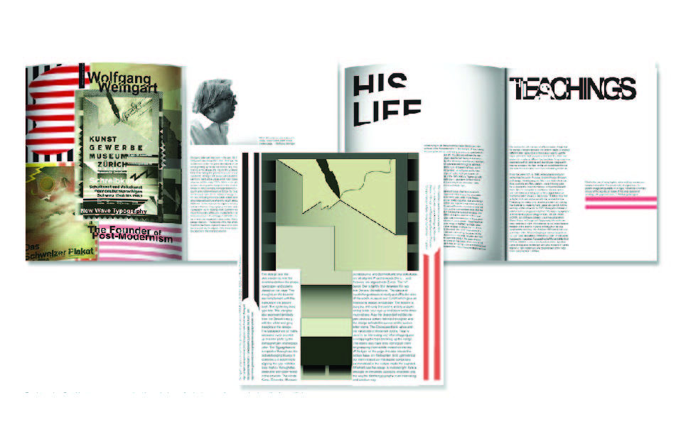 For this project David had to create a magazing biography layout for the founder of post-modernism; Wolfgang Weingart. He added objects that are representations of objects in Wolfgangs art. He also altered the type to match Wolfgangs form of typography and his principles. The last page is a critiqu on one of his other works.to be exact the one in the center of the cover.